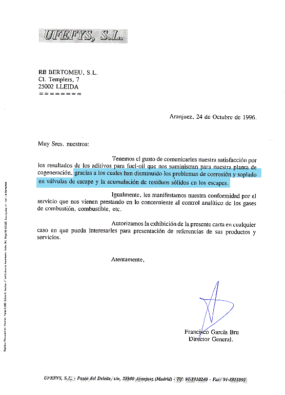 We are pleased to express our satisfaction with the fuel oil additive that you provide for our cogeneration [power] plant. Thank you to them, the corrosion problems have decreased as well as the exaust valves' blow-out and the sludge accumulation in the exhausts.