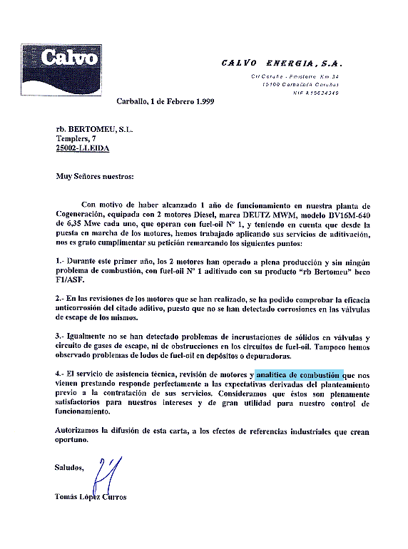 On the occasion of having reached 1 operational years of our cogeneration [power] plant, equipped with 2 DEUTZ MWM diesel engines, model 8V 16M-640, producing 6.35 Mwe each, which operate with fuel oil Nº1 and taking into account that we have been using your additivation services from the beginning, we are pleased to reply to your request highlighting the following points: