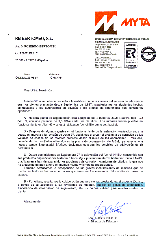 C - Since we began the additive treatment in September - 97 of fuel - oil Nº BIA “rb bertomeu” products beco Mg and later “rb bertomeu” beco F1/ASF, practically all the corrosion problems previously cited have disappeared, which has produced a great saving in maintenance and repair time.