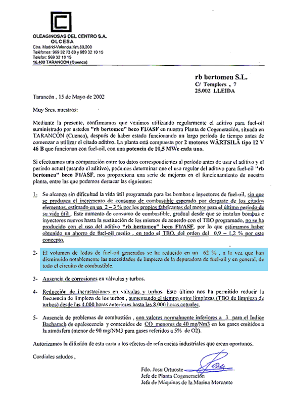 fuel oil additive supplied by your company,in our cogeneration [power] plant, which is located in Vilches in